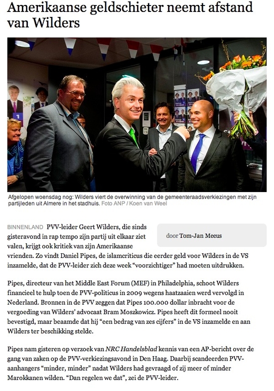 Mar 22, 2014 updated Mar 23, 2014 He's now in hot water for calling on a reduction in the number of m Moroccans in the Netherlands. Tom-Jan Meeus of the leading newspaper NRC Handelsblad asked my opinion on this development. I wrote a response that both endorsed and criticized Wilders: As is often the case, I disagree with Mr Wilders' tactics while sympathizing with his goals. It is entirely understandable that the indigenous peoples of a country feel stress when large numbers of immigrants from an alien civilization, more than a few of them hostile, move in. Wanting to bring this transfer of peoples under control is sensible - just as Moroccans feel when Dutch and other Europeans turn up in Marrakesh, just as a Dutch newspaper reported in 2010 (see http://www.danielpipes.org/blog/2010/05/european-immigrants-in-marrakech). That said, I wish that Mr Wilders went about protesting this issue in a more cautious way. Meeus devoted a whole article to this little response, "Amerikaanse geldschieter neemt afstand van Wilders," which translates as "U.S. money-lender distances himself from Wilders." This title is inaccurate in two ways: First, the Middle East Forum Education Fund did not lend money to Wilders but paid his lawyer to cover his legal expenses. Second, I did not distance myself from Wilders here but merely reiterated long-standing differences with him. In his article, Meeus also ignored my point that Moroccans likewise are uneager to have more Europeans live among them. In brief, NRC Handelsblad dropped the nuances of my response to recruit me as another voice against Wilders. Shame on it. (March 22, 2014) ![]()