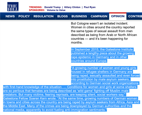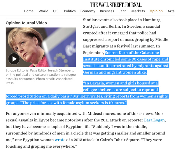 migration in European countries.Fox News' Megyn Kelly interviewed Gatestone Institute Distinguished Senior Fellow Soeren Kern about the cultural repercussions the migrant crisis has created in Europe. ![]() This September report from Kern on the rape epidemic in Germany, perpetrated by migrant men against German and migrant women, was cited by The Wall Street Journal's Bret Stephens in his article "The Cologne Portent." ![]() Stephens writes: "In September, Soeren Kern of the Gatestone Institute chronicled some 30 cases of rape and sexual assault perpetrated by migrants against German and migrant women alike. 'In Bavaria, women and girls housed at a refugee shelter. . . are subject to rape and forced prostitution on a daily basis,' Mr. Kern writes, citing reports from women's rights groups. 'The price for sex with female asylum seekers is 10 euros.'" ![]() Katie Pavlich, a columnist at The Hill, one of the most widely read publications on Capitol Hill and in the White House, also cited Kern's report about the spike in sexual assaults in Germany. ![]() Pavlich wrote, "In September 2015, the Gatestone Institute published a lengthy piece about the growing rape epidemic in Germany and in other countries around Europe," and then quoted Kern. ![]() The reports from Gatestone Institute Distinguished Senior Fellow Ingrid Carlqvist on the problems of assimilation in Sweden seem to have inspired a spate of articles echoing the same information, often without attribution; a year ago there had been zero reporting on Sweden. Khaled Abu Toameh, Gatestone Institute's Distinguished Senior Fellow and an award-winning journalist, was first to scoop that ISIS was trying to infiltrate Gaza and the West Bank. He was also the first to scoop that a new Iranian-backed terrorist group, Harakat al-Sabireen, is infiltrating Gaza and the West Bank. |