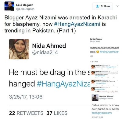 blasphemy. #HangAyazNizami trended on Twitter in Pakistan