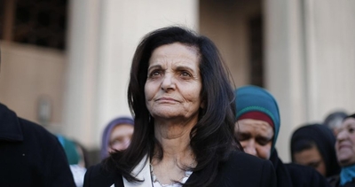 outside a forum featuring Rasmea Odeh, who served time